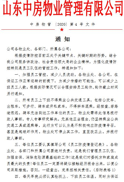 疫情就是命令,中房物業在戰斗防控新型冠狀病毒肺炎阻擊戰工作簡報2020年3月9日 第6期主辦:標準化監管部一、總公司動態1.公司下發《中房物管〔2020〕第6號文件》,頒布《山東中房物業管理有限公司疫情防控規范標準》...